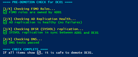 Write-Host "If all items show ✅, it is safe to demote $OldDC." -ForegroundColor White