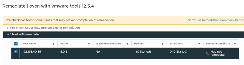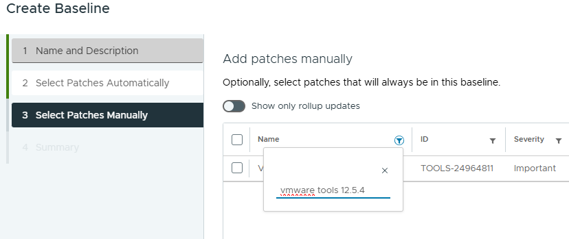 In het volgende scherm zet je het schuifje om zodat je niet enkel de rollup updates ziet en filter je bij naam om vmware tools 12.5.4.