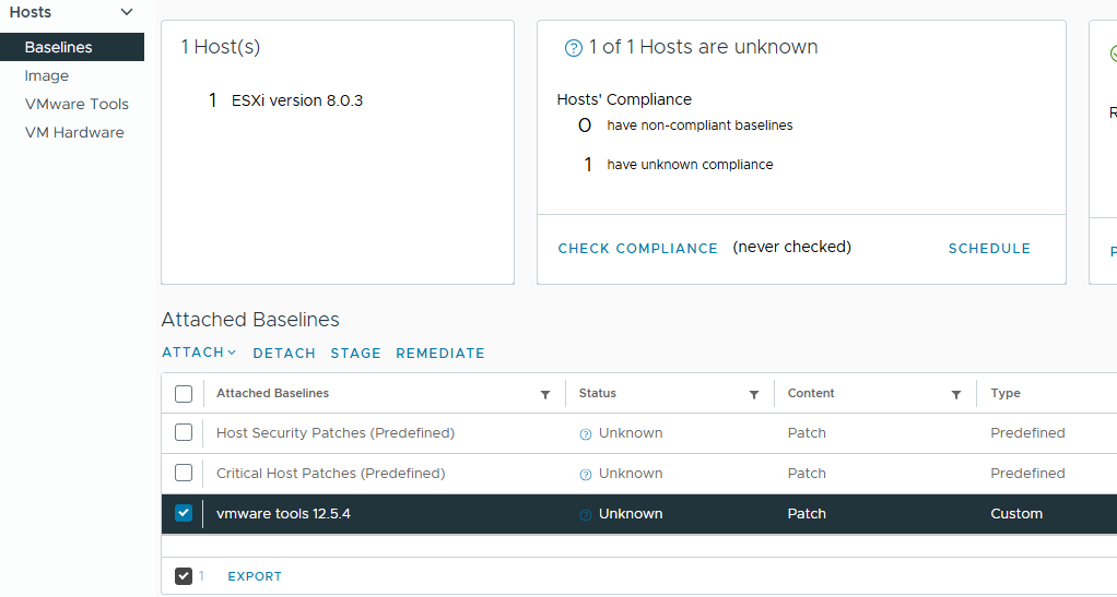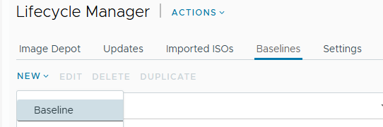 Zodra de sync klaar is, gaan we een Baseline maken die de nieuwe VMware Tools bevat. Hiervoor gaan we naar Baselines waar we kiezen voor New > Baseline.