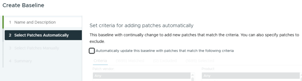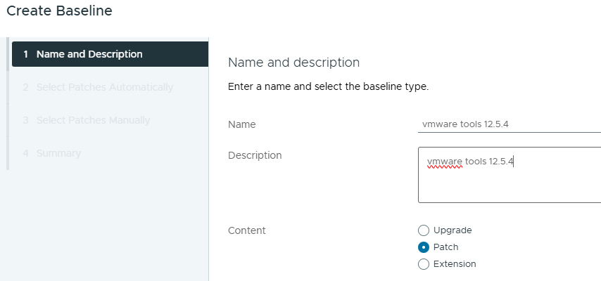 Geef je Baseline een naam, vmware tools 12.5.4 is wel handig om deze herkenbaar te maken. Selecteer bij Content Patch en klik op Next