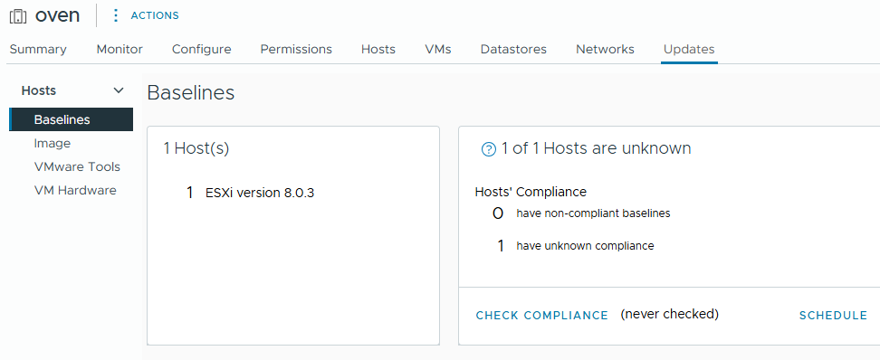 Nu schiet het niet op om de iso te uploaden naar je datastore en handmatig te mounten aan je VM’s. Je wil dit op een makkelijke manier doen. Daarvoor gebruik je de Lifecycle manager in vCenter.