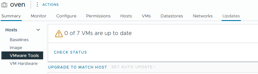 Zodra de vmware tools images zijn bijgewerkt op je host(s) ga je naar het kopje VMware Tools. Hier kun je al je vm’s selecteren en zorgen dat ze vmware tools bijwerken om te matchen met de versie die nu aanwezig is op je host.