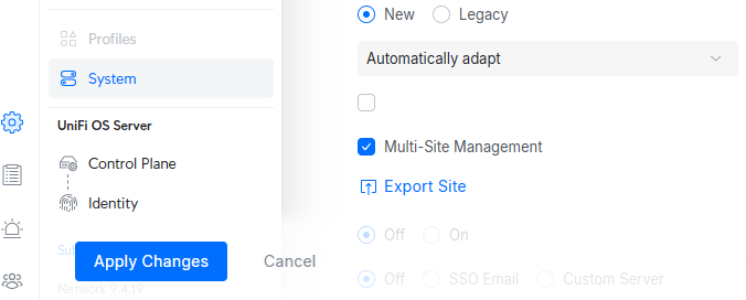 Klik daarom op het tandwiel en klap het menu uit. Ga vervolgens naar System om daar een vinkje bij Multi-Site Management te plaatsen. Bevestig nu door op apply changes te klikken.